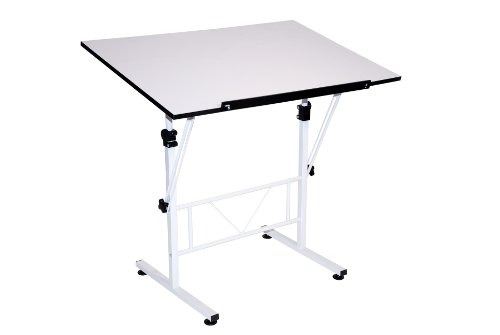 Our Hobby and Art Drawing Table has a large 24-Inch by 36-Inch white laminate top with pencil edge. Easy tilt able top for multi-use. White enamel base of steel. Cross-braced frame with floor levelers for stability. Easy grip knobs enable adjustable to desk height. Assembly required.