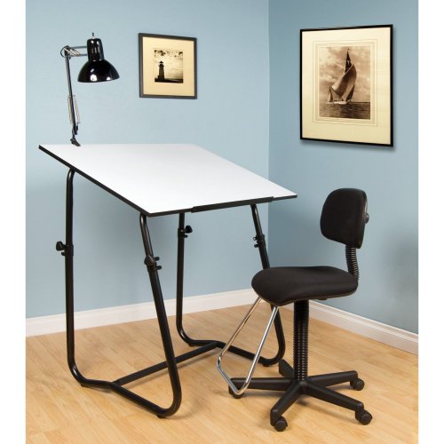 Set includes drawing table, chair, lamp and art tray What We Like About the 3-piece Work Station Create a solid and stable work station with this set. The drawing table is strong and durable, and a stabilizer bar keeps it steady for you. You can work at the perfect height because of the adjustable table top and pneumatic drafting chair. Plus, the chair moves around on five casters. Reduce eye strain by illuminating your work with the swing arm lamp that clamps onto the table. Table is white on one side and black on the other side so you chose which is right for you. Swing arm lamp clamps to the work surface. Pneumatic mobile drafting chair with footrest. Chair height range is 22 to 32 inches. Tech tabletop adjusts to a maximum angle of 35 degrees. Includes 16 compartment pencil-storage tray.