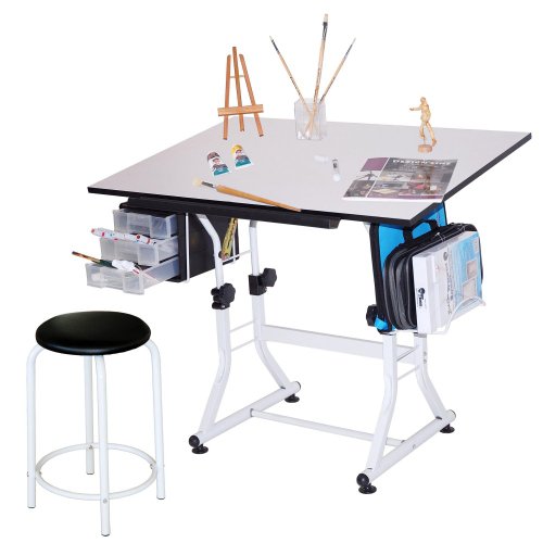 Designed for all your creative needs, the Ashley Creative Center by Martin Universal makes the perfect craft/hobby/drawing table, especially in homes or apartments where space is a consideration. A large tabletop, one-hand tilt mechanism, and adjustable height ensure your convenience and comfort at all times. The tubular steel base in lasting powder-coated white finish and the tabletop with durable PVC edging offer years of enjoyment. This handsome and sturdy table also has a set of three drawers for storage, a foldable utility rack, and a pencil trough to keep your craft or drafting supplies handy. It comes with a stool with a padded, non-flammable-fabric seat. A must-have for craft enthusiasts or drafting professionals, the Ashley Creative Center by Martin Universal is not only attractive and functional but also designed to provide years of enjoyment and dependable service. Additional Features: Large 24L x 36W-inch table top with durable PVC edging Foldable utility rack Handy pencil trough Includes 4 adjustable foot glides Base sports lasting powder-coated white finish Comes in 1 sturdy carton with some easy assembly required About Martin Universal Design, Inc. Over 40 years ago, Dennis Kapp founded Martin Universal Design, Inc., which incorporated the wholesale, importing, and manufacturing of Northwest Blue Print, the company Mr. Kapp's father founded in 1946. The Kapp family then purchased a business started by Ray Martin, who was the first designer and crafter of drafting templates in the United States. Since then, the family has been carrying on the tradition of creating high-quality artist accessories and furniture. Today, Martin Universal Design, Inc. supplies the art industry with a complete range of quality artist accessories, drafting tables, materials, and tools. One-hand tilt mechanism adjusts table from 0-45 degrees. Sturdy wood and wood laminate table top. Base crafted from sturdy 1.5-diam. tubular steel.