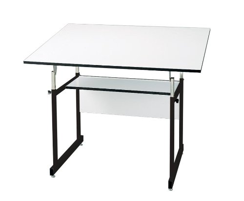 Lifetime warranty! . Includes Jr WorkMaster Table base and White Drawing Board . Height adjusts from 29 in. to 44 in. in horizontal position . Angle adjusts from 0 to 35 . 12 in. x 32 in. storage shelf . Sturdy base constructed of 1 in. x 1 in. heavy-gauge steel tubing . Pictured in Black . 42 in. L x 31 in. W (68 lbs.) . 48 in. L x 36 in. W (80 lbs.) A 4-post table that adjusts easily, from front or rear, for a comfortable work angle. Versatile and attractive, the WorkMaster can be used as a reference table, computer workstation, or drafting table. Counter-balance not required when using drafting machine. Ideal for architects.