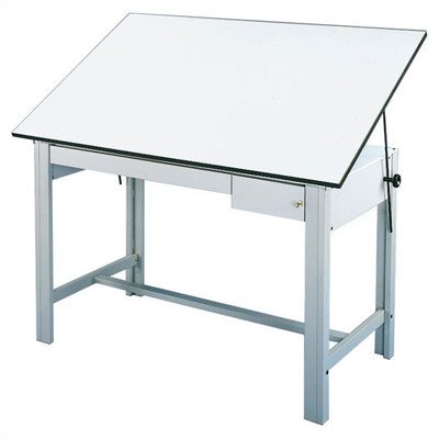 Adjust your perspective on functional, affordable office furniture. An essential for engineering & drafting firms, this durable table has a steel base and everlasting melamine top. Plus, you can tilt the top to your liking. Handy drawer included on any size & base color you choose. Includes table base, top and 2 drawers . Tabletop board and supporting panels are made of 0.75 in. therma-fuse Melamine . Surface is smooth, durable, white matte Melamine . Trimmed with bonded black vinyl edges . Made of 18-gauge steel tubing (not pre-fab sheet steel) . Height can be adjusted from 0 to 45 . Legs are welded together to form a 3 in. x 2 in. post for maximum strength, stability and rigidity . All metal parts are scratch resistant and electro-static powder coated . Offered with or without tool and reference drawers . Tool drawer is supplied with lock and equipped with ball-bearing slides . All bases are equipped with built-in fittings for the purchase of the 2 drawers if not bought originally Drafting Table Sizes: . 60 in. L x 37.5 in. W x 37 in. H (153 lbs.) . 72 in. L x 37.5 in. W x 37 in. H (166 lbs.) . Table Top Size: 60 in. L x 37.5 in W x 37 in. H . Drawer Size: 23 in. L x 31 in. W