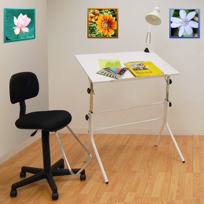 A complete set: table, chair, and swing arm lamp. 35.5- x 24-inch work surface with 8 height adjustments. Table adjusts in angle from zero to 35 degrees. White swing-arm drafting lamp extends up to 36 inches. Maxima II Drafting Chair with pneumatic seat adjustment. Chrome footrest, adjustable backrest, rolling casters.
