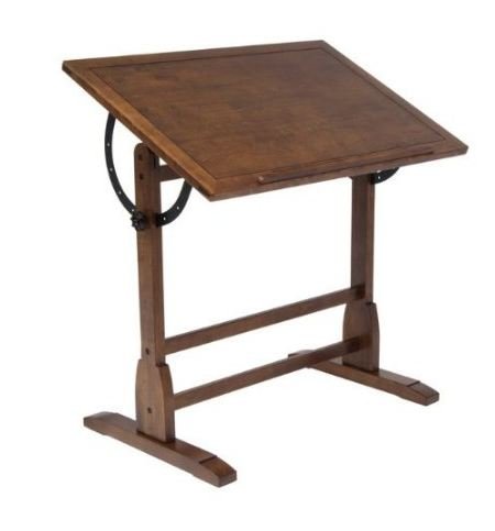 The Vintage Drafting Table by Studio Designs features a Sleek Vintage design that makes an ordinary work space stand out. The 42 inch by 30 inch main work space features a built-in 24 inch pencil ledge and can be modified from flat to an angle of 90 degrees allowing for versatility. Composted of rustic oak, the solid wood frame gives this drafting table excellent stability and support. Overall dimensions are 42inches wide by 30 inches deep by 34-49.5 inches tall.