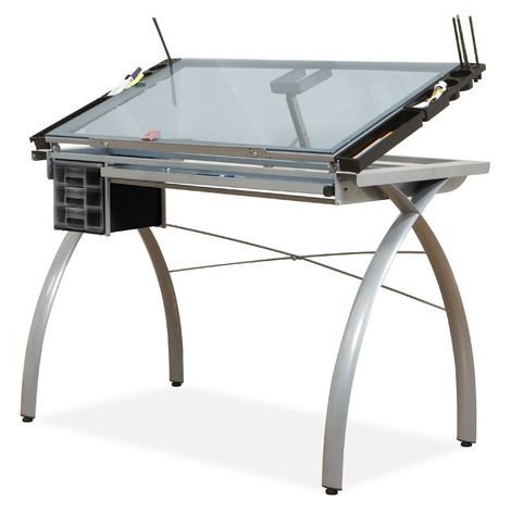 Tempered Blue Safety Glass Top. Can be used as a Light Table. Top Angle adjustment Up to 35 Degrees. 3 Plastic Molded Slide Out Drawers for Storage which can be mounted on left or right side of table. Four Removable Side Trays for Supplies. 28 in. W x 9.5 in. D Pencil Storage Drawer. Heavy Gage Steel Construction for Durability. (4) Floor Levelers for Stability. 24 in. Slide Up Pencil Ledge. 43.25 in. W x 24 in. D x 31.5 in. - 45 in. H. Main Work Surface 38 in. x 24 in.
