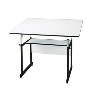 A durable, 4-post table that is versatile and sturdy with built-in strength for hard, long-term use. The angle of the work surface can be adjusted easily from either front or rear. Sturdy base constructed of 1" x 1" heavy-gauge steel tubing. Can also be used as a spacious reference table. Ideal for drafting, mechanical drawing, and architecture. |Warp-free 31" x 42" or 36" x 48" white Melamine® board |Angle adjusts from horizontal (0°) to 35° |Height adjusts from 29" to 44" in the horizontal position |Base available in black or white |12" x 32" storage shelf with modesty panel