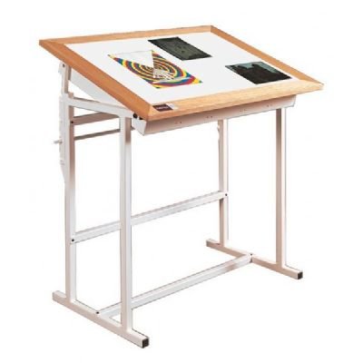 A sturdy tracing unit trimmed in solid oak and mounted on a white enamel base. Top has tiltangle adjustment from 0° to 40° every 10°. Units come with Plexiglas® work surface and 5000K daylight lamps. All models ship without glass. Detailed instructions are included if glass is necessary.