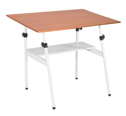 Includes an easy U channel grove bracket . Shelf attaches to bracket for support . Shelf can be slid along table side-support brackets to vary location . Cherry wood top with white shelf . Assembly required . Top: 30 in. L x 42 in. W . Base: 29 in. to 53 in. (Adjustable height) . Shelf: 12 in. L x 32 in W