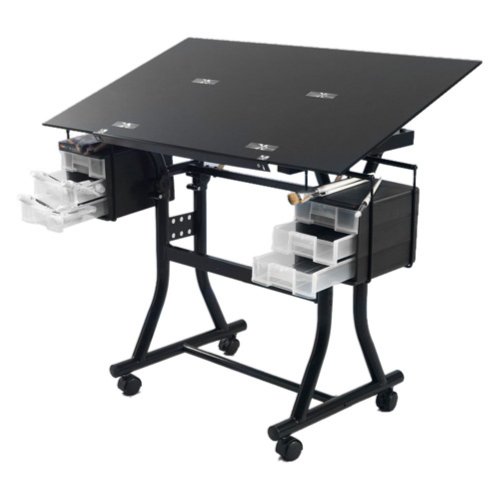 The Martin Universal 40 x 24 in. Creation Station with Smoke Glass Top is ready to assist you in crafting, drawing, and much more. You can adjust the height anywhere from 31 inches to 34 inches, and the top tilts to the best angle for the user - from flat to 45 degrees. This table has a large 24-inch by 40-inch tempered glass top with pencil ledge. The strong steel base has a black powder-coat finish, and 4 caster wheels, 2 of which lock into place. Whether you are a novice or a professional, this is a great table for your home. About Martin Universal/F. Weber Co. For a century and a half, the name Martin Universal and F. Weber Co. have been synonymous with quality art materials. Established in 1853 in Philadelphia, Pa., the Martin/Weber is the oldest and one of the largest manufacturers of art materials in the United States. Table adjusts from 31 to 34 inches. Durable tempered glass table top, steel base. Includes six storage drawers. Some assembly required. Dimensions: 40W x 24D x 31H inches.
