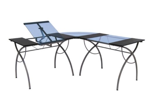 Full L-shaped corner workcenter with split top. Powder-coated steel frame with leg levelers. Two 20- x 23.75 tempered blue glass work surfaces. Right-side glass adjusts from flat up to 35 degrees. Four 10- x 23.75 flat black work surfaces. 20-inch slide-up pencil ledge. Glass corner connector: 23.75L x 23.75D inches. Each side dimensions: 40W x 23.75D inches.